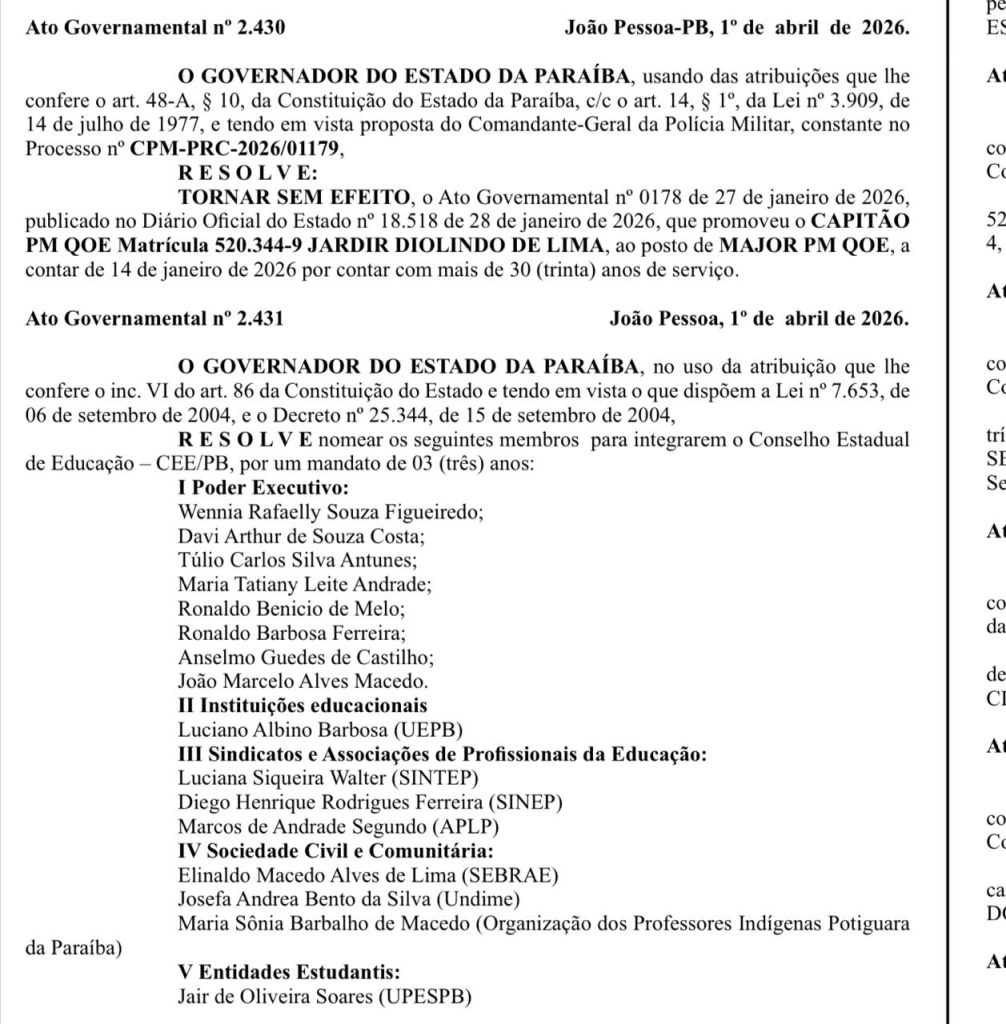 Foi publicada no Diário Oficial do Estado, na edição desta quinta-feira (02), por meio do Ato Governamental nº 2.431, de 1º de abril de 2026, a nomeação dos novos membros que passarão a integrar o Conselho Estadual de Educação da Paraíba (CEE-PB) para o próximo mandato de três anos.