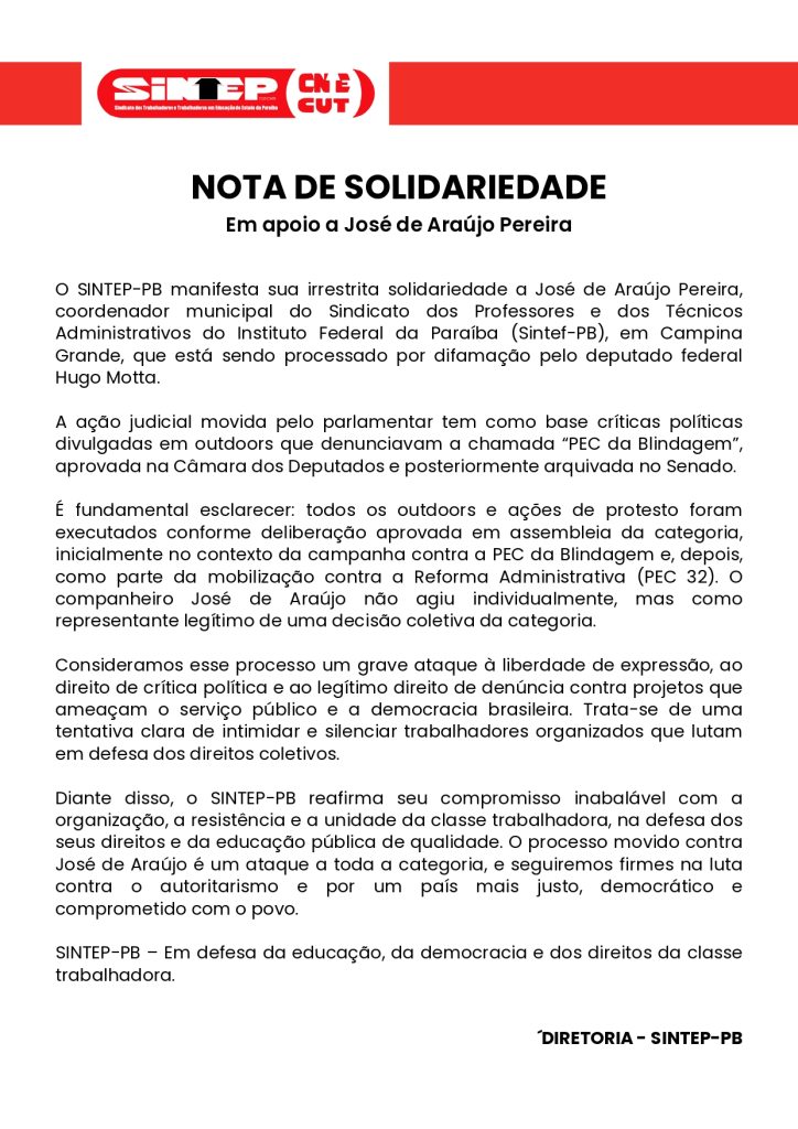 Leia a nota de solidariedade emitida pelo Sintep em apoio ao Coordenador Municipal do Sindicato dos Professores e dos Técnicos Administrativos do Instituto Federal da Paraíba (SINTEF-PB), José de Araújo Pereira,de Campina Grande, que está sendo processado por difamação pelo Deputado Federal Hugo Motta.