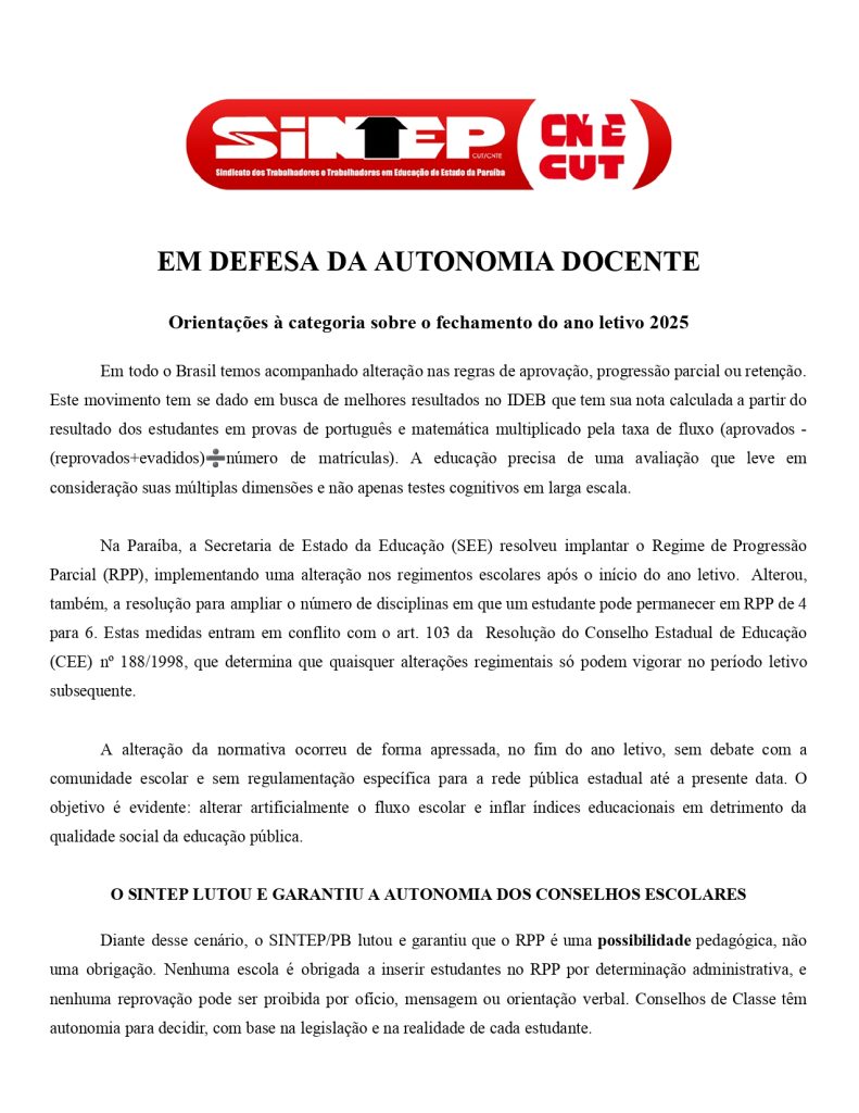 O sindicato alerta que o RPP é uma possibilidade pedagógica, não uma obrigação, e reafirma a autonomia dos Conselhos de Classe para decidir sobre aprovação e retenção dos estudantes, conforme a legislação educacional. Também denuncia pressões e assédio moral contra profissionais da educação, especialmente por meio de mensagens informais, que não têm valor normativo.