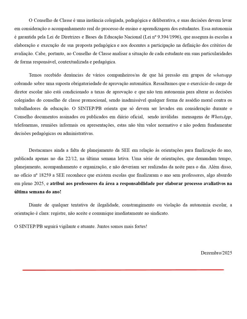 O Sintep- PB por meio da secretaria de Gestão Escolar e Especialista em Educação orienta as trabalhadoras e os trabalhadores em educação sobre o fechamento do ano letivo de 2025 e denuncia mudanças nas regras de aprovação e progressão escolar adotadas para elevar artificialmente os índices educacionais, como o IDEB.