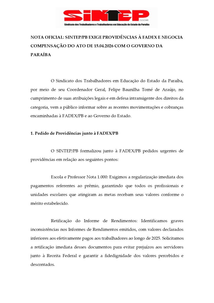 O SINTEP-PB formalizou em nota oficial uma série de cobranças à Fundação de Apoio ao Desenvolvimento da Educação da Paraíba (FADEX-PB) e ao Governo do Estado. Entre os principais pontos estão atrasos no pagamento de premiações por desempenho e denúncias de assédio moral contra professores em estágio probatório.