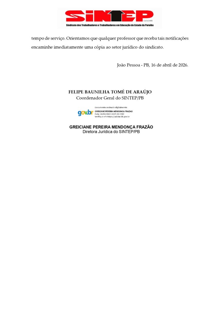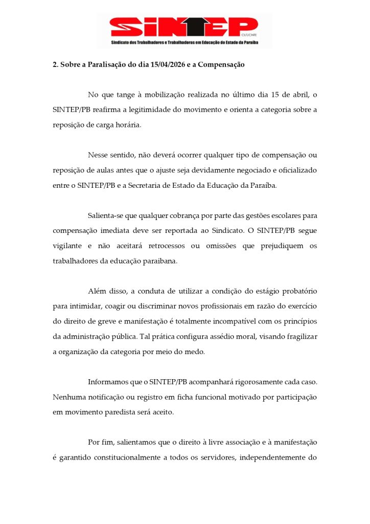 Para o SINTEP-PB, a prática configura violação de direitos constitucionais e ressalta que a liberdade de associação e manifestação é garantida a todos os servidores públicos, independentemente do tempo de serviço, e afirma que não aceitará qualquer tipo de punição ou registro funcional decorrente da participação em movimentos da categoria.